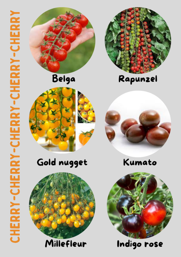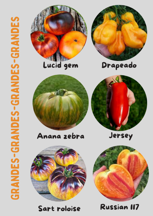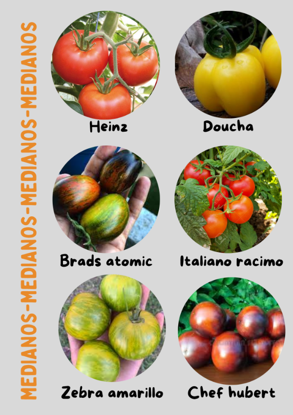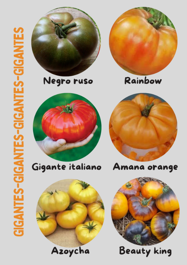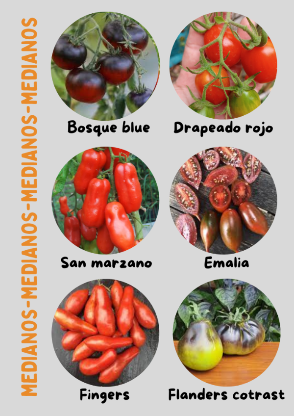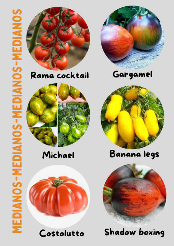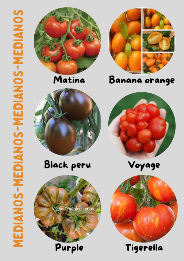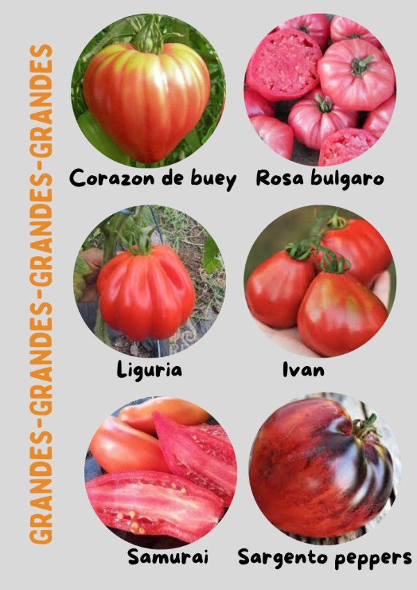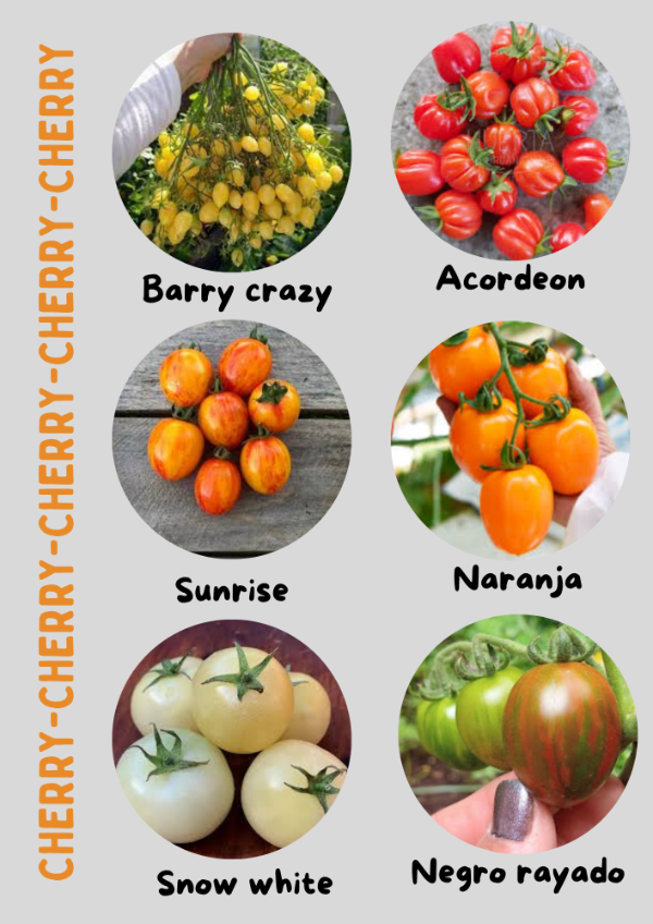 Matina - Azoycha Russian - Negro de crimea- Rama cocktail -Amana orange -Bosque Blue - Rainbow racimo- Costolutto di parma -Cherry Grosella- Cherry lágrima roja- Cherry gota de oro -Cherry gold Nugget- Tigerella -Cherry trufa de chocolate -Cherry indigo rose- Lucid gem -Cherry Snow white- Negro ruso- Beauty king- Millefleaur - Banana orange -Banana legs -Sunrise -Gargamel- Drapeado -Kumato -Corazón de buey- Black beauty -Gigante italiano -Dwarf beauty king -Anana zebra -Negro vernissage- Michael pollan -Santorange -Liguria- Barao Golden -Ivan kumpala- San marzano-Gigante Belga -Heinz- Prune verte- Lucinda -Brads Atomic- Goldman italian- Barry crazy -Shadow boxing -Berry -Royal fingers- Voyage- Canestrino- Doucha peppers amarillo- Doucha peppers rojo- Italiano racimo -Cherry belga- Rapunzel -Black keyes- Espada samurai- Cherry berry grande- Black Perú -Chef hubert -